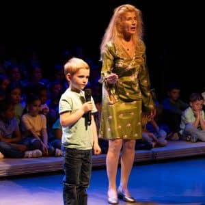 Dominique Dimey en concert sur scène avce les enfants